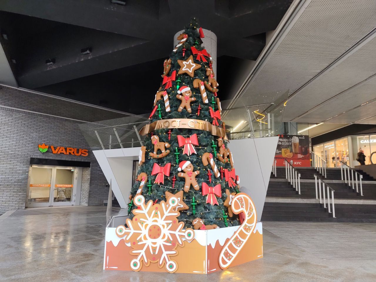 Біля «Мост-сіті» на своєму вже традиційному місці знаходилася штучна ялинка, прикрашена бантами, пряниковими чоловічками та іграшками конячками-гойдалками. Увечері на ній запалюють ілюмінацію.