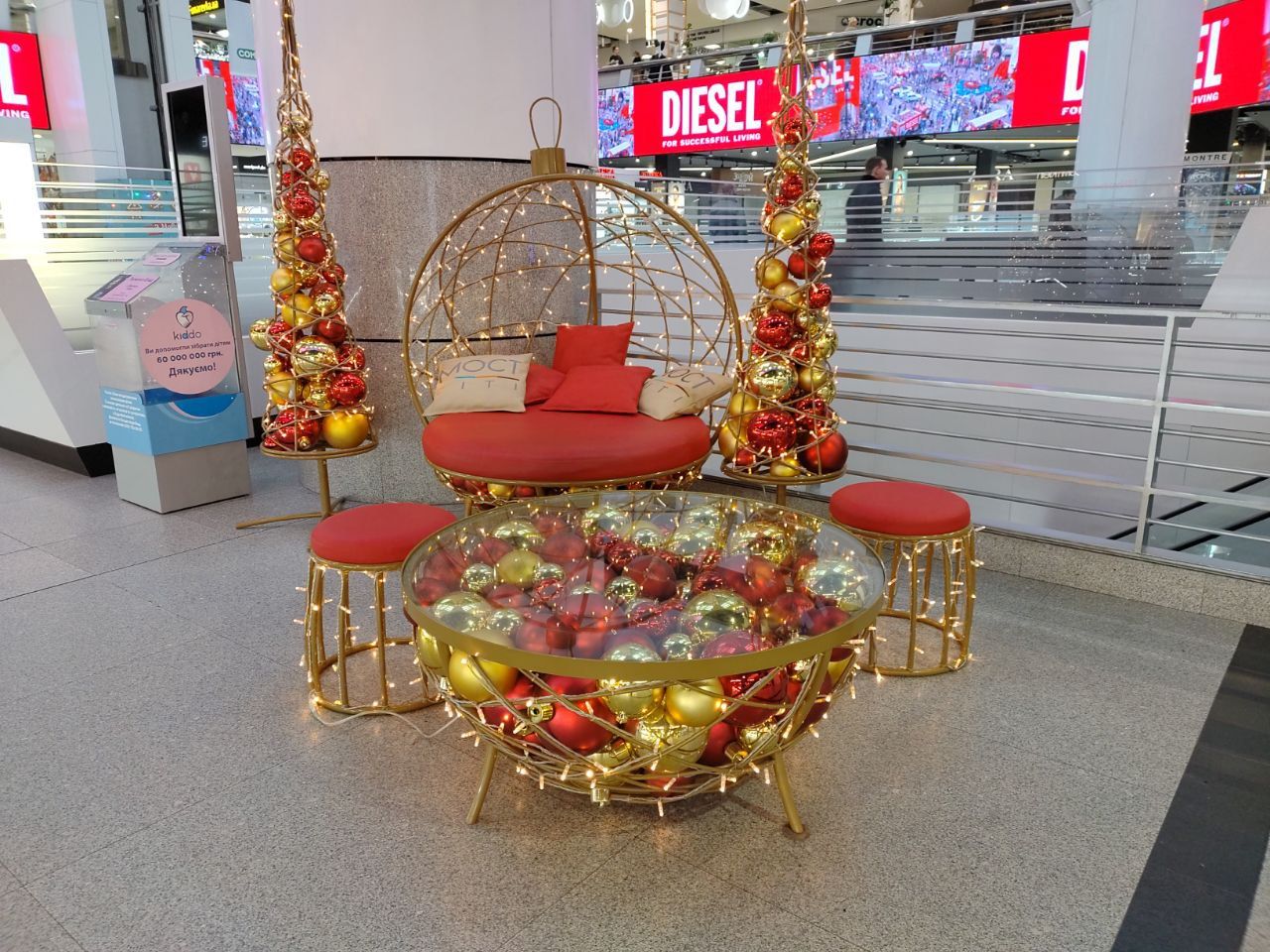 Ще одна новорічна фотозона знаходиться у ТЦ «Мост-Сіті». Вона виконана у червоно-жовтих тонах. Тут можна зробити як фото із друзями, так і на самоті. Декорація символізує ялинкову іграшку, в яку може сісти герой фото, поряд стоять кілька символічних ялинок із новорічних кульок.