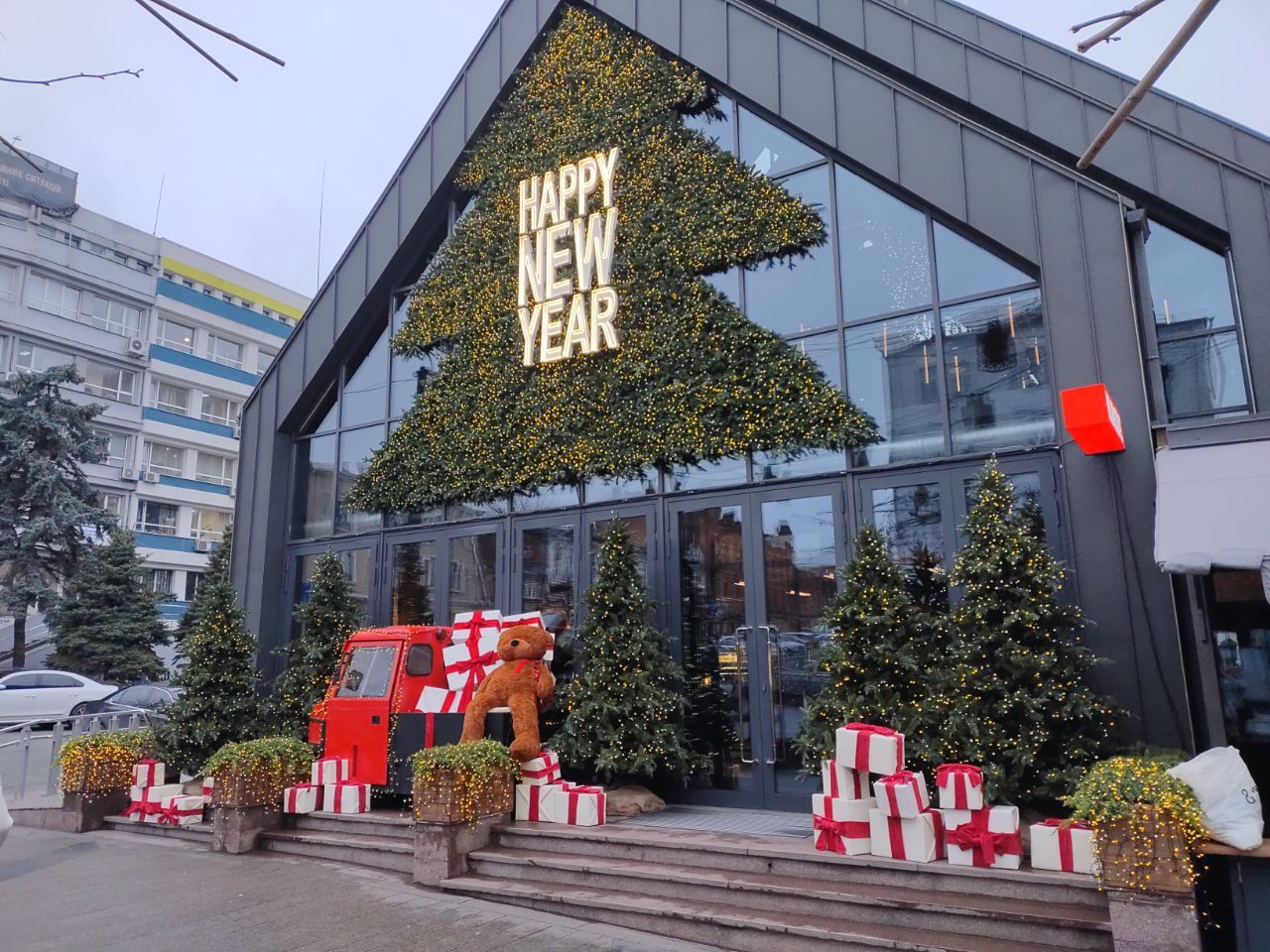 Власники торгових мереж, магазинів та ресторанів Дніпра продовжують прикрашати зону навколо своїх закладів новорічними декораціями. Тематичні іграшки, кульки, ялинки та символи привертають увагу перехожих, перетворюючи простір біля магазину чи ресторану на фотозону.