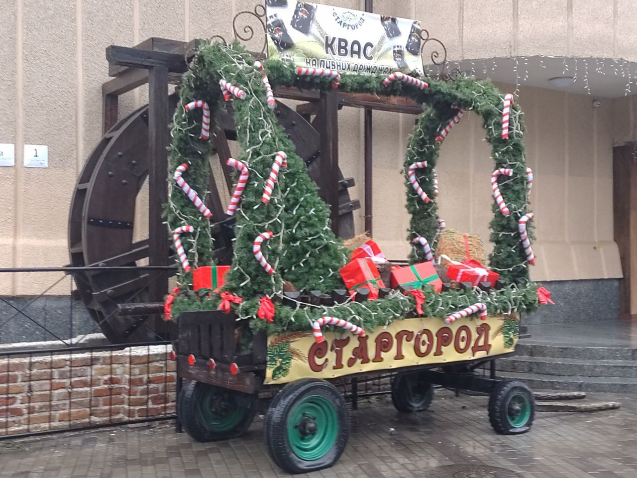 Поруч із рестораном на місці колишнього кінотеатру «Родина» з'явилася незвичайна фотзона – новорічний візок, прикрашений гілками сосни, фігуркою Санта-Клауса, новорічними цукерками у біло-червоних тонах.