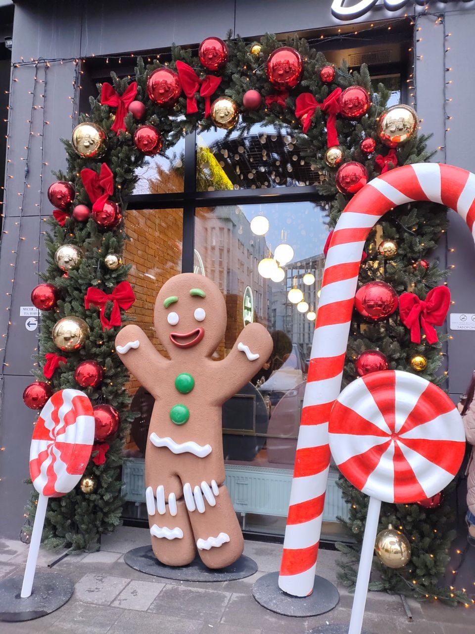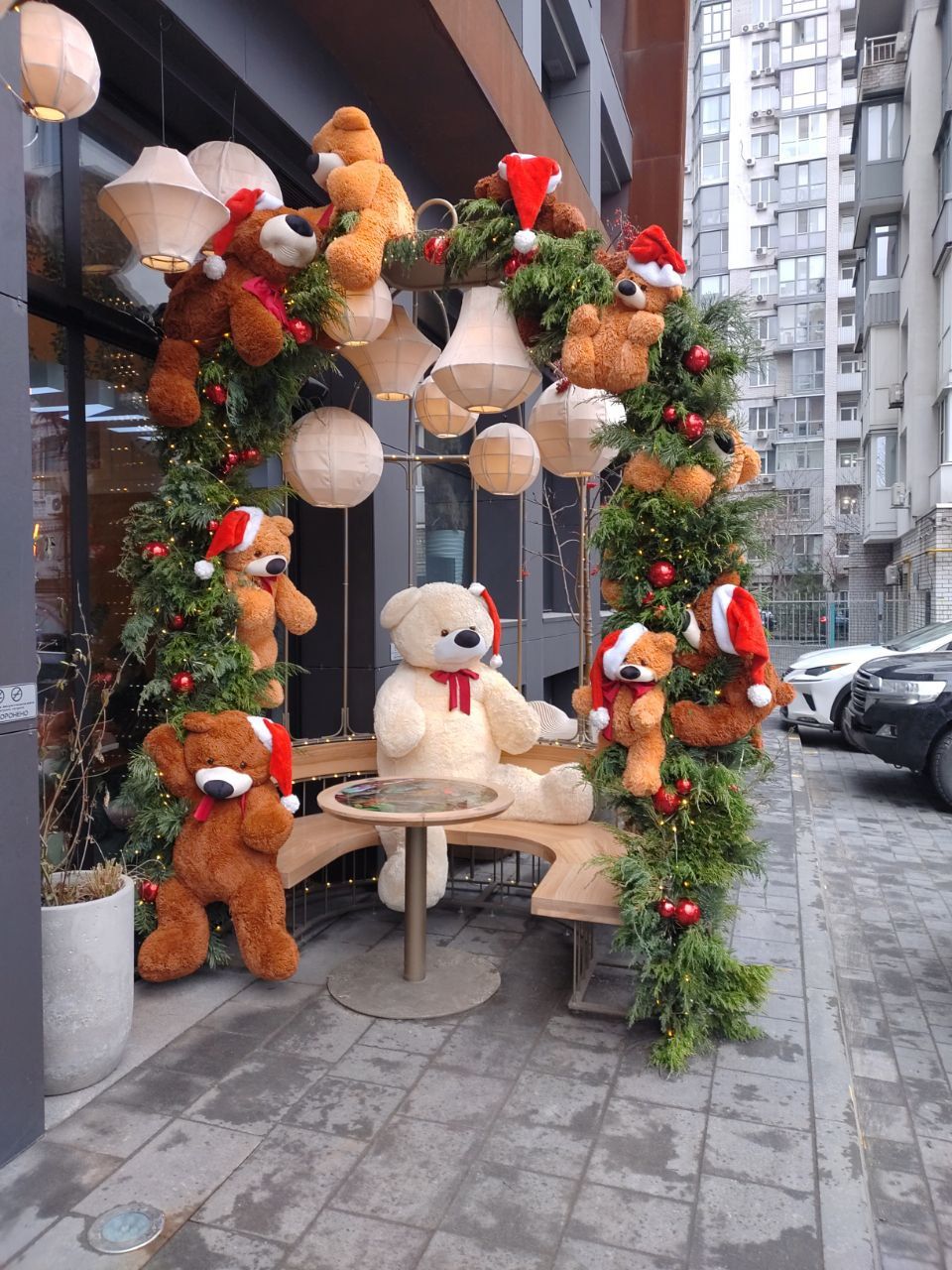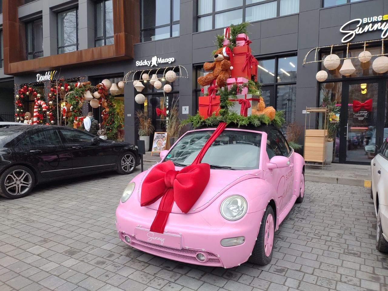 На пішохідній частині вулиці Короленка, біля одного із закладів з'явилася велика кількість «подарунків» - білих величезних коробок пов'язаних червоною «стрічкою», червона машина, ведмедик «Тедді», кілька ялинок та багато новорічних гірлянд.