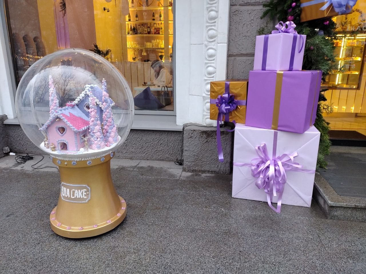 Біля кафе-кондитерської неподалік вулиці Короленка, на проспекті Яворницького, з'явилися декорації у вигляді коробочок із подарунками. Всі вони виконані в різних відтінках фіолетового кольору, а поруч із входом стоїть щось на кшталт «Снігової кулі», але снігу там немає, а є симпатичний пряничний замок. Така декорація припаде до душі маленьким дітям.