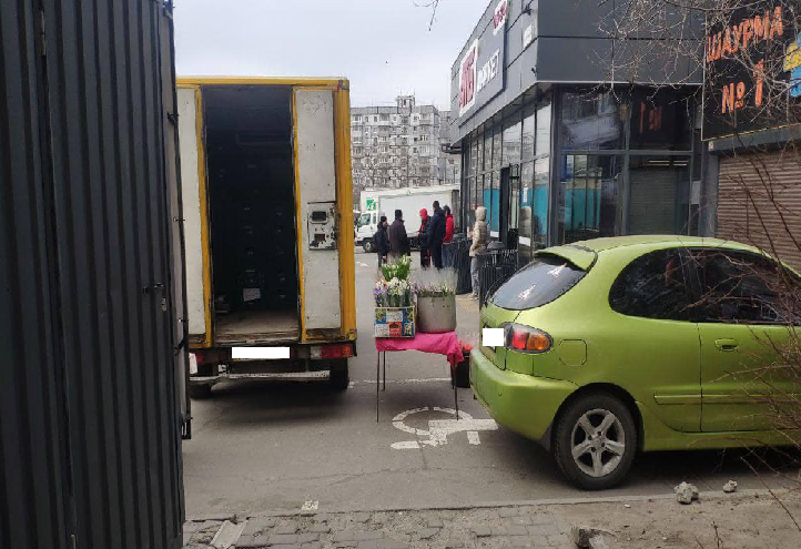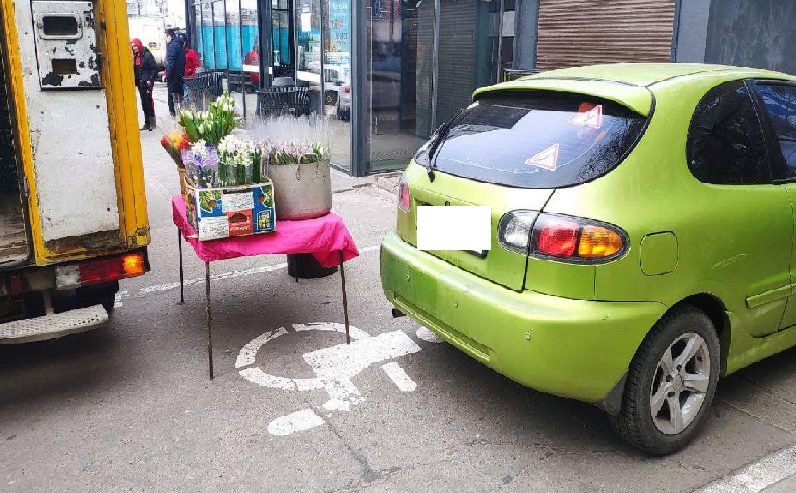 Так, на вулиці Міхновського біля одного із АТБ продавчиня з квітами зайняла інвалідне місце на парковці та повністю перекрила прохід для пішоходів.