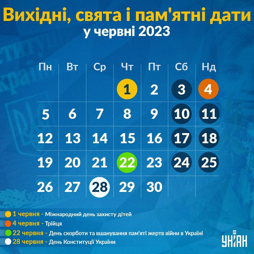 Усього в червні буде 22 робочих дні і 8 - вихідних: 3, 4, 10, 11, 17, 18, 24 і 25 числа.