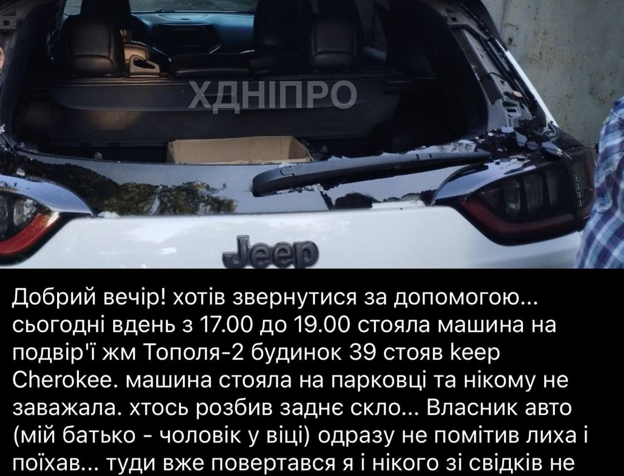 Сьогодні (ред. - 25 липня) вдень з 17:00 до 19:00 стояла машина на подвір'ї ж/м Тополя-2... стояв keep Cherokee. Машина стояла на парковці та нікому не заважала. Хтось розбив заднє скло. Власник авто (мій батько - чоловік у віці) одразу не помітив лиха і поїхав. Туди вже повертався я і нікого зі свідків не зміг знайти, - розповів автор публікації.