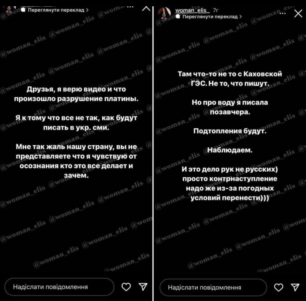 Блогерка із Дніпра Єлизавета, яка представляється астротарологинею та астропсихологинею, звинуватила у підриві Каховської ГЕС Україну. У своєму Instagram вона запостила сторіс, в якій зазначила, що в неї "болить душа за Україну", але "це точно не справа рук росіян".