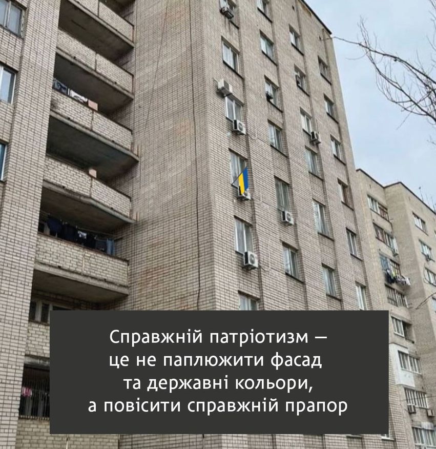 Як пояснив Сергій Білий, кольори прапору через рік-два вицвітуть, а підфарбовувати фасад ніхто не буде, тому це насправді неповага до державного символу. Замість цього він пропонує вивісили з вікна квартири справжній прапор.