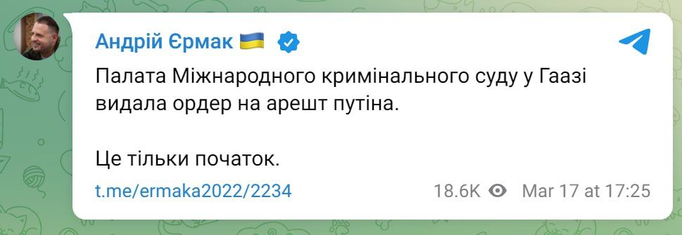 Палата Міжнародного кримінального суду у Гаазі видала ордер на арешт путіна. Це тільки початок, - написав керівник ОП Андрій Єрмак.