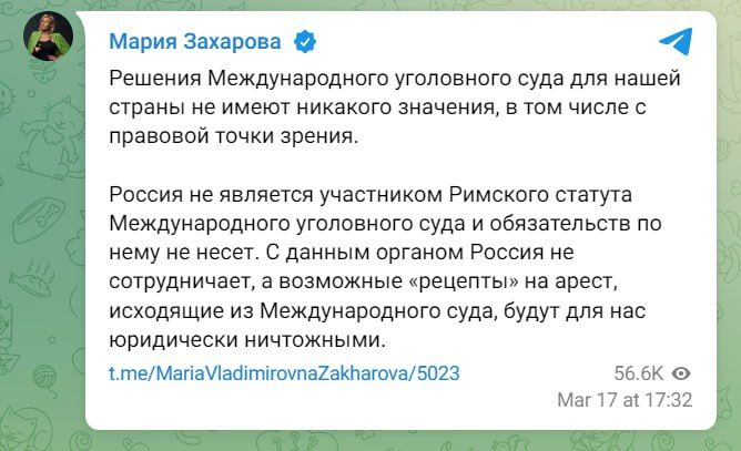 Так, офіційний представник МЗС росії Марія Захарова написала, що "рішення Міжнародного кримінального суду для нашої країни не мають жодного значення, зокрема, з правової точки зору".