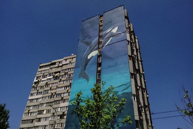 Фасад 16 поверхових будинків з початку здачі в експлуатацію постійно є «рекламною» площею. Спочатку на кожному будинку були літери «КПРС», що світилися навіть уночі, потім лампочки перегоріли. А наприкінці 1990-х років на даху кожного будинку з'явилися інші літери, які рекламували тодіщню політичну партію, вони також підсвічувалися ночами. Нині стіну будинків прикрашають мурали.