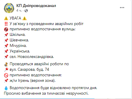 Про це повідомляє КП "Дніпроводоканал".
