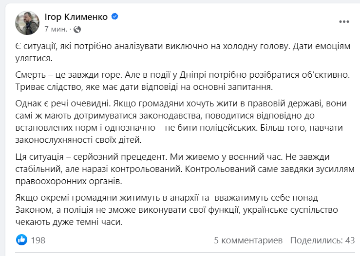 Є ситуації, які потрібно аналізувати виключно на холодну голову. Дати емоціям улягтися. Смерть – це завжди горе. Але в події у Дніпрі потрібно розібратися об’єктивно. Триває слідство, яке має дати відповіді на основні запитання, - написав він.