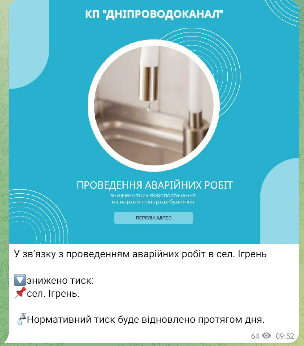 Також у зв’язку з проведенням аварійних робіт знижено тиск водопостачання в селищі Ігрень.