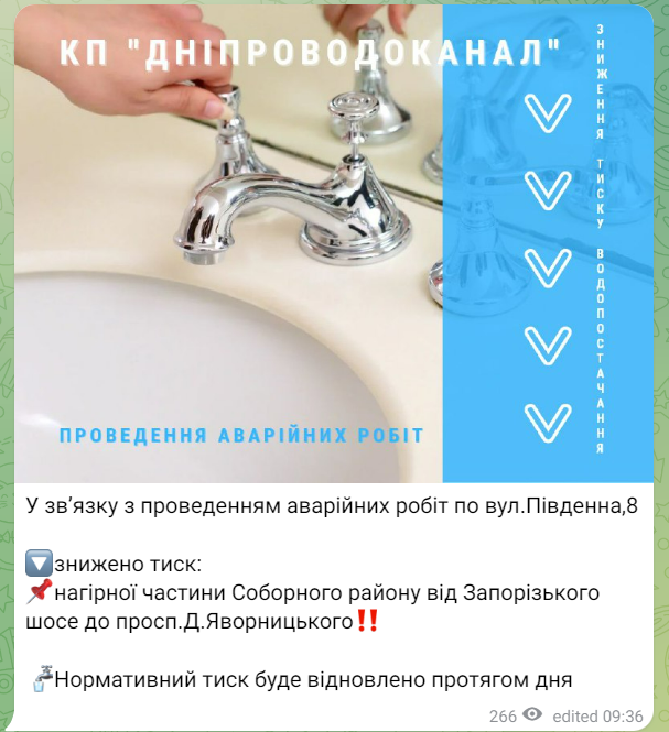 Сьогодні, 19 грудня, у нагірній частині Соборного району - від Запорізького шосе до просп. Д. Яворницького - знижено тиск подачі води.