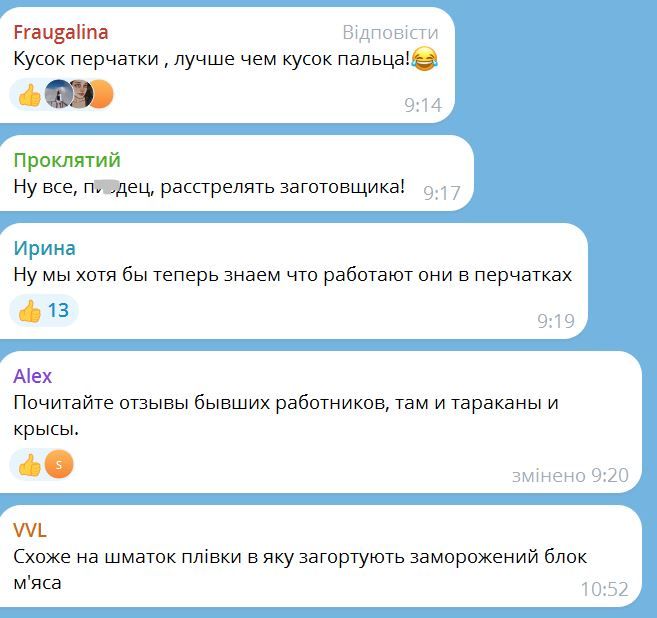 Коментатори припустили, що це не рукавиця, а шматок упаковки, у якій зберігають м'ясо. Виробник напівфабрикатів поки що ситуацію не коментував.