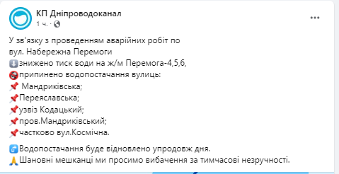 Як повідомили в КП "Дніпроводоканал", це пов'язано з проведенням аварійних робіт на вул. Набережна Перемоги.