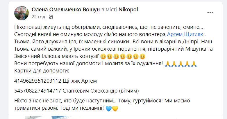 Як розповіла знайома родини Олена, 29-річного волонтера Артема Щигляка та його 34-річну дружину Ірину ушпиталили до лікарні Дніпра. Разом з ними двоє маленьких синів, які отримали контузію внаслідок обстрілу.