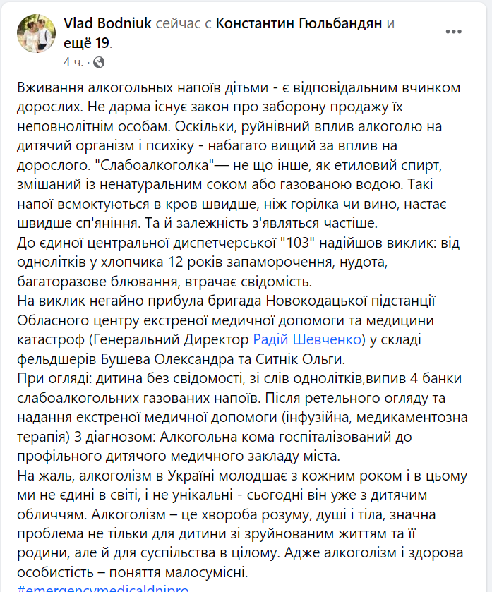 Під час огляду: хлопчик без свідомості, зі слів однолітків, випив 4 банки слабоалкогольних газованих напоїв. Після ретельного огляду та надання екстреної медичної допомоги, з діагнозом - алкогольна кома - госпіталізований до профільного дитячого медичного закладу міста, - додав Владислав.