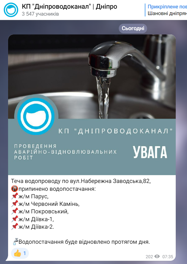 Сьогодні у Дніпрі п'ять житлових масивів залишилися без води. Йдеться про ж/м Парус, ж/м Червоний Камінь, ж/м Покровський, ж/м Діївка-1 та ж/м Діївка-2.