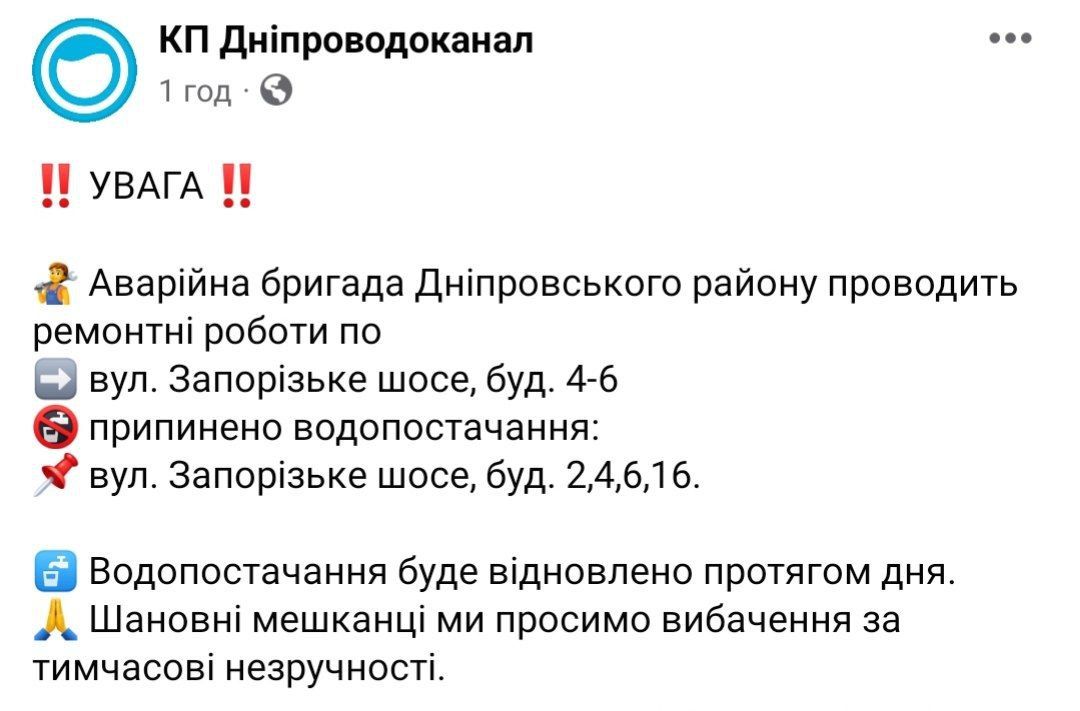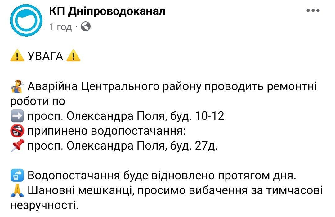 Деякі мешканці Дніпра наразі без водопостачання через ремонтні роботи.