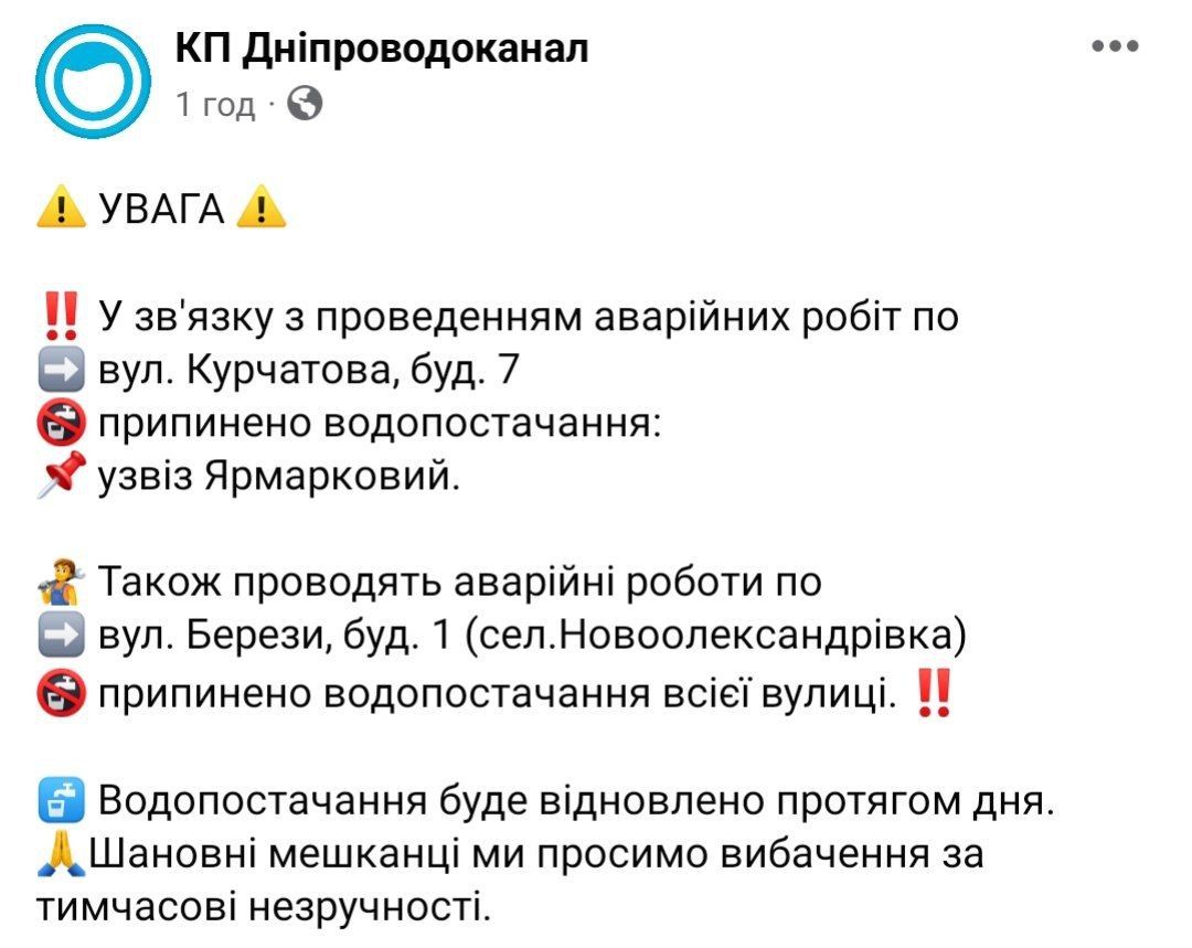 На жаль, окрім аварійних вимкнень світла у Дніпрі сьогодні екстренно відключають воду. Так, за інформацією Дніпроводоканалу, сьогодні 20 грудня без водопостачання через ремонтні робити залишилися споживачі за такими адресами: