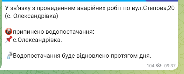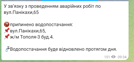 Крім того, у зв'язку з проведенням аварійних робіт припинено водопостачання:
