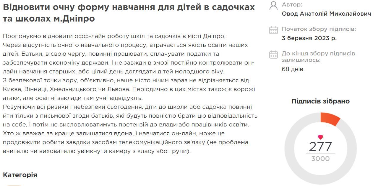 За місяць петиція зібрала 277 голосів із 3 тисяч необхідних. Втім, заняття в дніпровських школах і далі проходитимуть онлайн. Зазначимо, що 27 березня в школярів закінчуються весняні канікули.