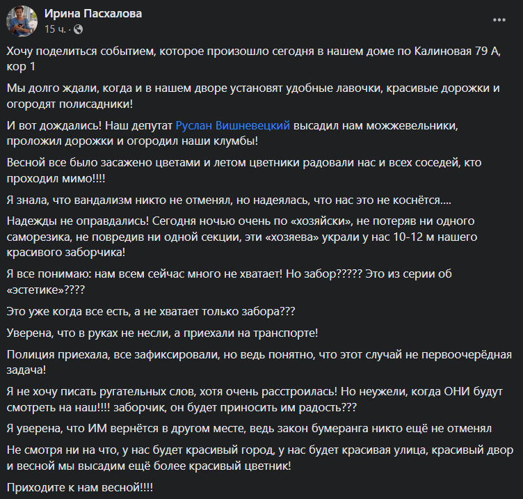 Але нещодавно хтось вкрав 12 метрів металевого паркану, який огороджував клумбу. Цікаво те, що конструкцію зняли обережно, відкручуючи кожен ґвинтик, тому Ірина допускає, що хтось забрав цей паркан собі на дачу, адже все було зроблено "по-господарськи".
