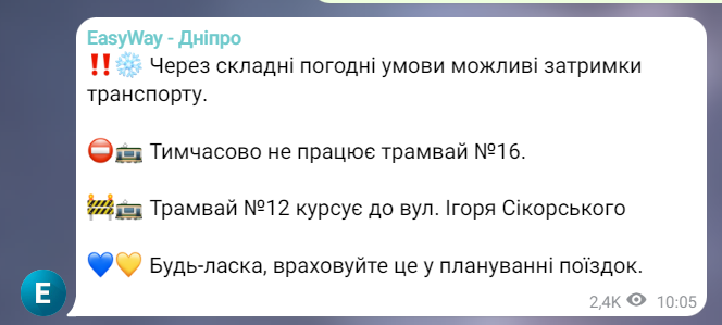 Оновлено: за даними порталу "EasyWay - Дніпро", у Дніпрі тимчасово не працює трамвай №16, а трамвай №12 курсує до вул. Ігоря Сікорського.