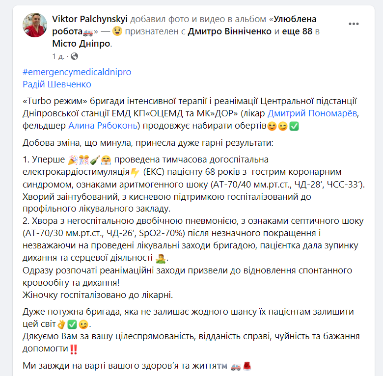 Одразу розпочаті реанімаційні заходи призвели до відновлення спонтанного кровообігу та дихання, - зазначив Віктор Пальчинський.