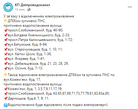 У Дніпрі через знеструмлення деякі мешканці залишилися без води: адреси