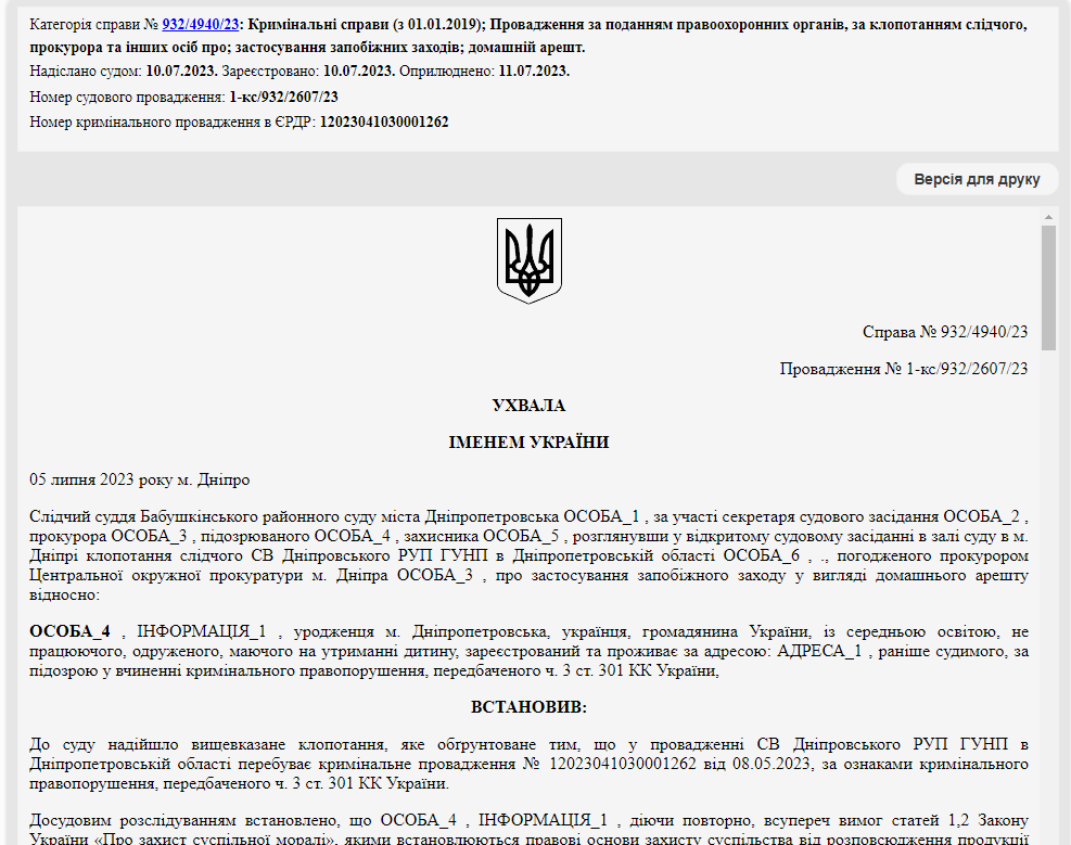 Про це йдеться в Єдиному державному реєстрі судових рішень.