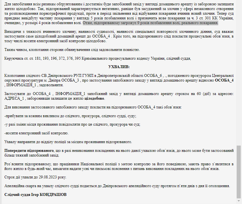 Зазначається, що раніше зловмисника вже судили за злочин у сфері незаконного створення та розповсюдження порнографічної продукції. Новий злочин він скоїв в період звільнення від відбування покарання.