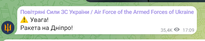 Увага! Ракета на Дніпро! - йшлося у повідомленні.