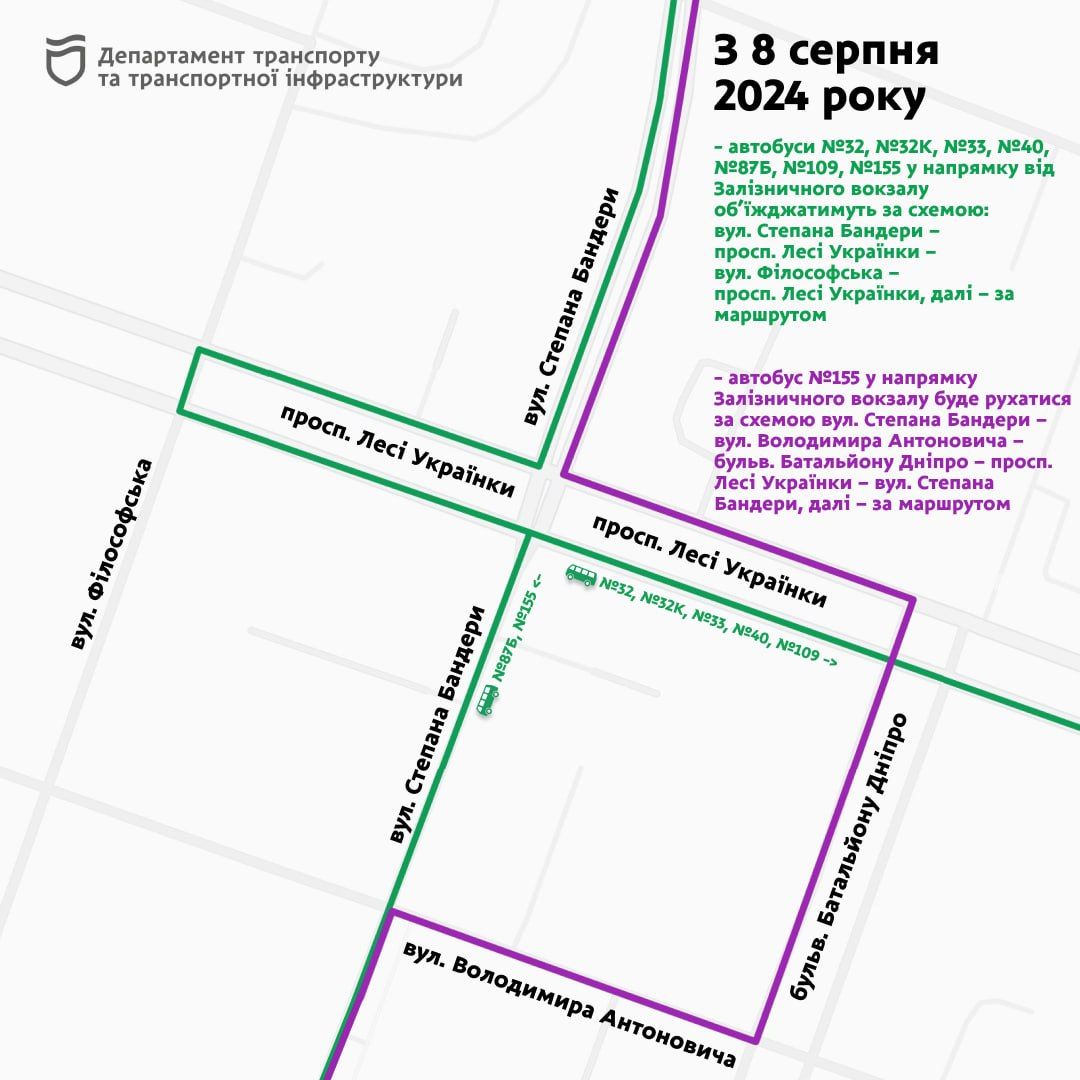 - автобуси №32, №32К, №33, №40, №87Б, №109, №155 у напрямку від Залізничного вокзалу об’їжджатимуть за схемою: вул. Степана Бандери – просп. Лесі Українки – вул. Філософська – просп. Лесі Українки, далі – за маршрутом;