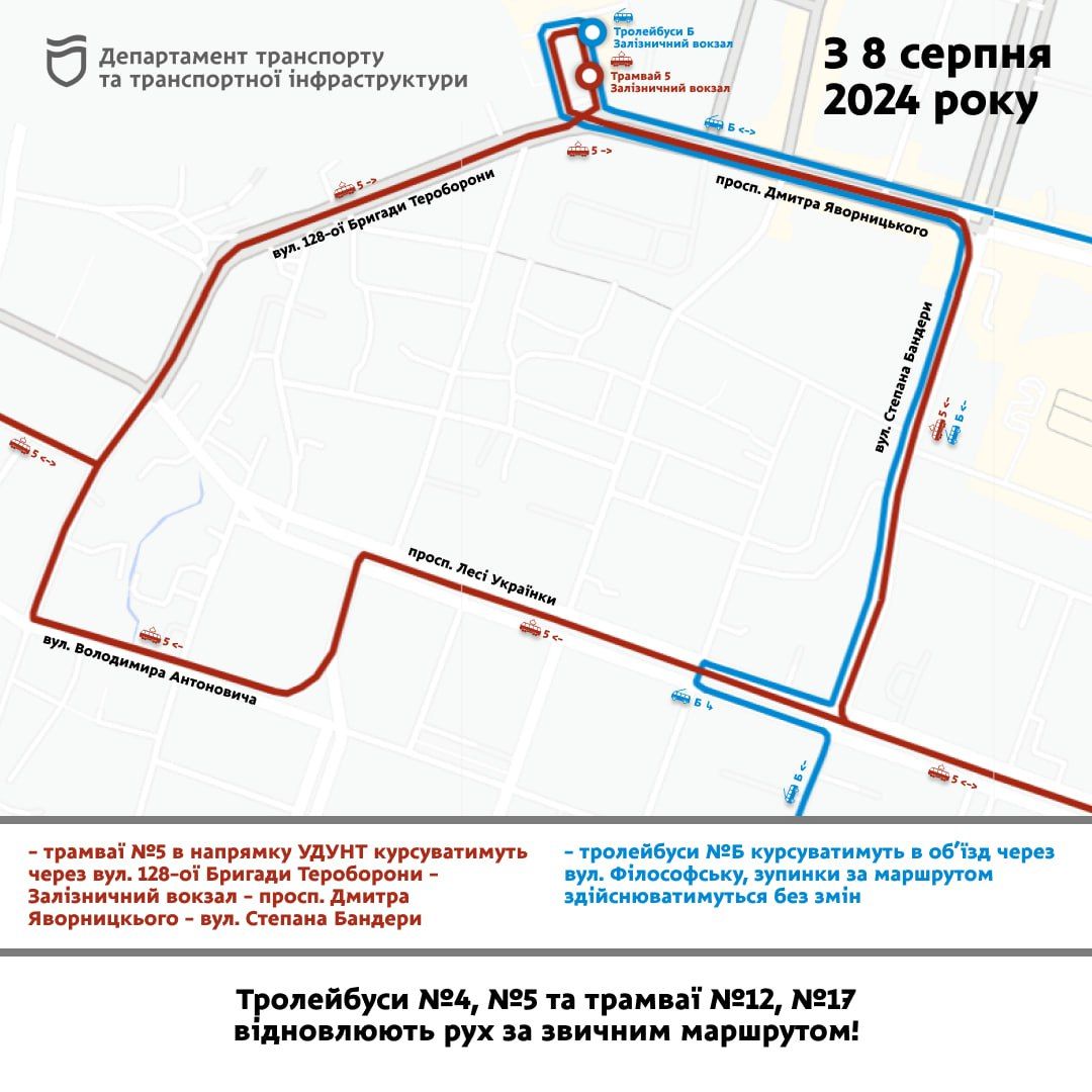 - трамвай №5 з 15:00 у напрямку УДУНТ почне курсувати за схемою: вул. Львівська - вул. 128-ої Бригади Тероборони - Залізничний вокзал - просп. Дмитра Яворницького - вул. Степана Бандери - просп. Лесі Українки, далі - за маршрутом;