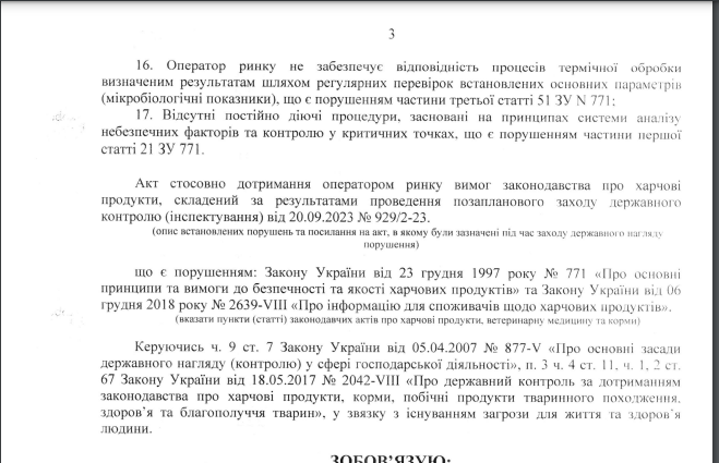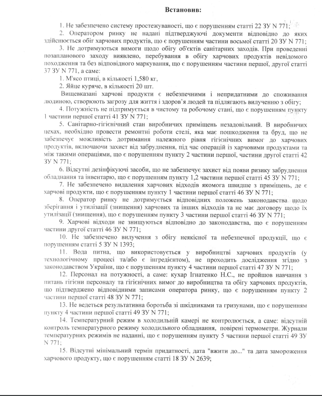 Після цього фахівці Держпродспоживслужби прийшли до закладу, щоб перевірити його. Вони знайшли численні порушення: брудні робочі поверхні; відсутність документів на деякі продукти, до того ж вони були не промарковані; у закладі не борються зі шкідниками та гризунами; у холодильниках не контролюється температура зберігання тощо.