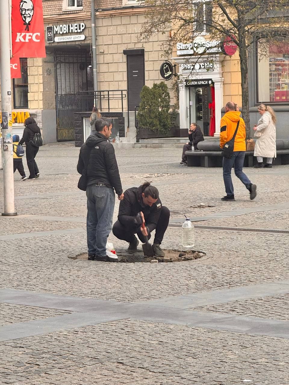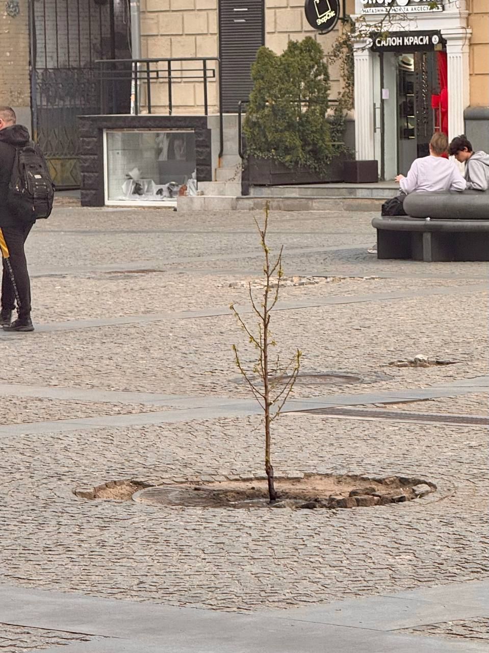 На Європейській площі багато лунок без дерев, ймовірно, не прижилися або ж засохли. До однієї з таких лунок підійшли хлопці із бутлем води, лопатою та саджанцем. Через якийсь час, завдяки їх зусиллям, в лунці з’явилося маленьке деревце.