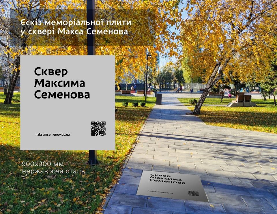 Розмістити плиту планують в сквері, який назвали на честь активіста. За словами головного художника Дніпра, уже є макет меморіальної мінімалістичної таблички, яку хочуть встановити найближчим часом. Вона буде зроблена із нержавіючої сталі та вмонтована в дорожню плитку.