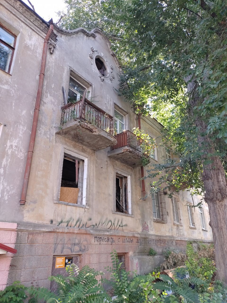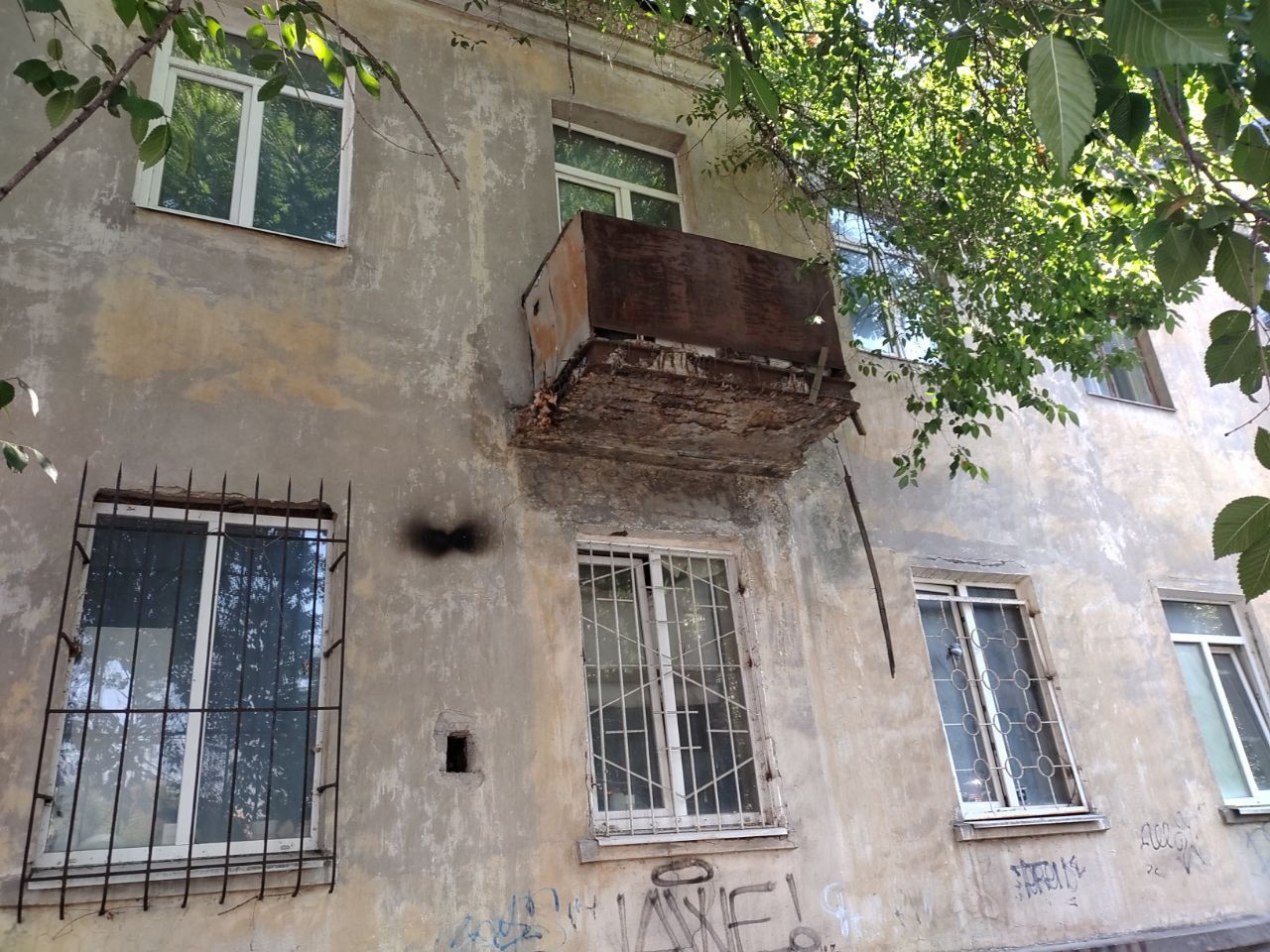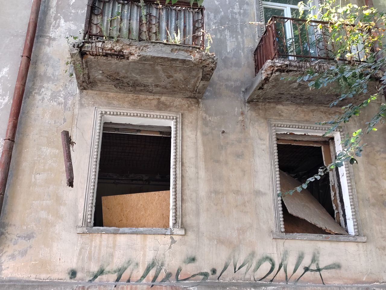 Будинок знаходиться не в кращому стані - аварійні балкони видно неозброєним оком, а якщо подивитись уважніше, то у деяких квартирах видно, як почала обсипатися стеля.