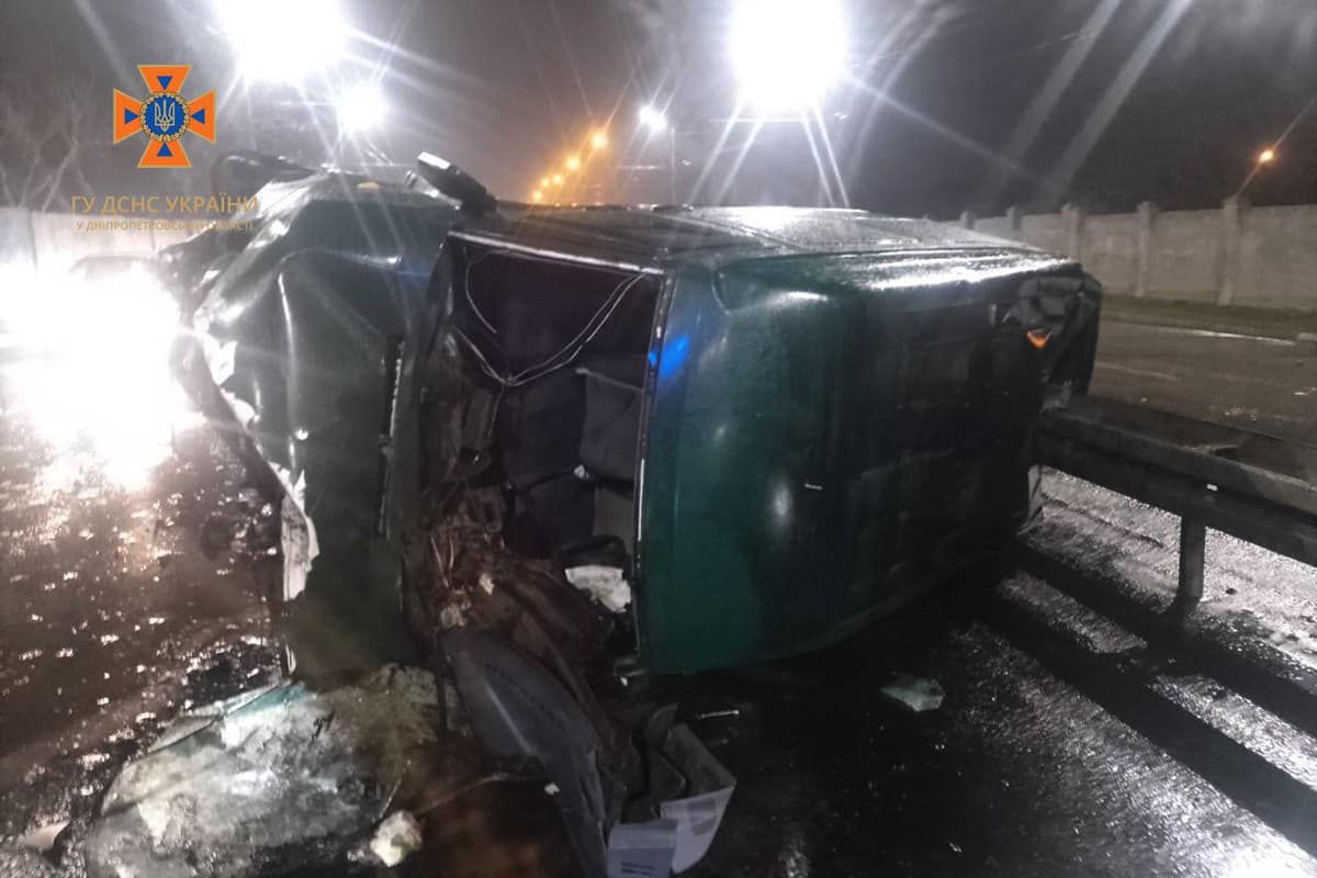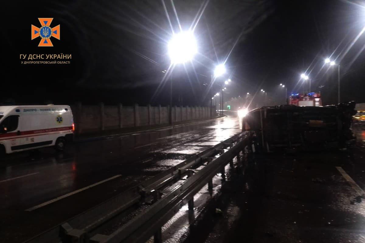 У Дніпрі Mercedes Sprinter зіткнувся з відбійником та перекинувся на бік (ФОТО)