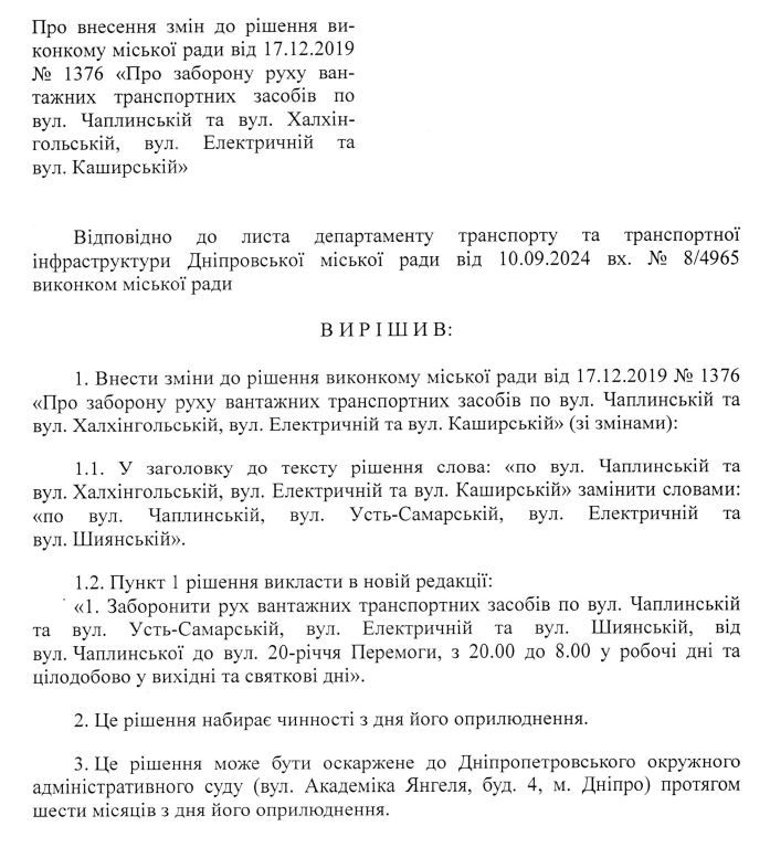 Заборонити рух вантажних транспортних засобів по вулиці Чаплинській та вулиці Усть-Самарській, вулиці Енергетичній та вулиці Шиянській, від вулиці Чаплинської до вулиці 20-річчя перемоги, з 20:00 до 8:00 у робочі дні та цілодобово у вихідні та святкові дні, - сказано у проєкті рішення.