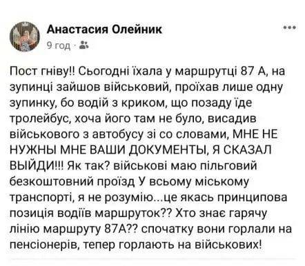 Як розповіла дніпрянка Анастасія, 1 жовтня вона стала свідком неприємного інциденту. У маршрутці 87А військового вигнали з маршрутки. За словами містянки, на одній із зупинок до салону зайшов чоловік у формі, але пасажир не встиг навіть показати свої документи, як на нього почав кричати водій. Маршрутник нібито хотів, щоб військовий вийшов з транспорту та пересів до тролейбуса, який їхав за ними.