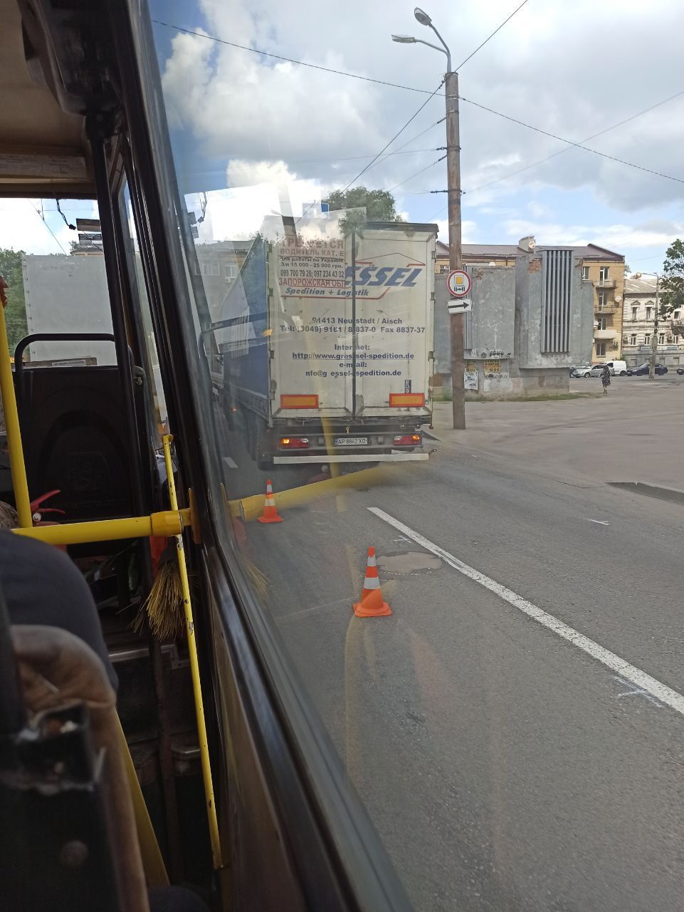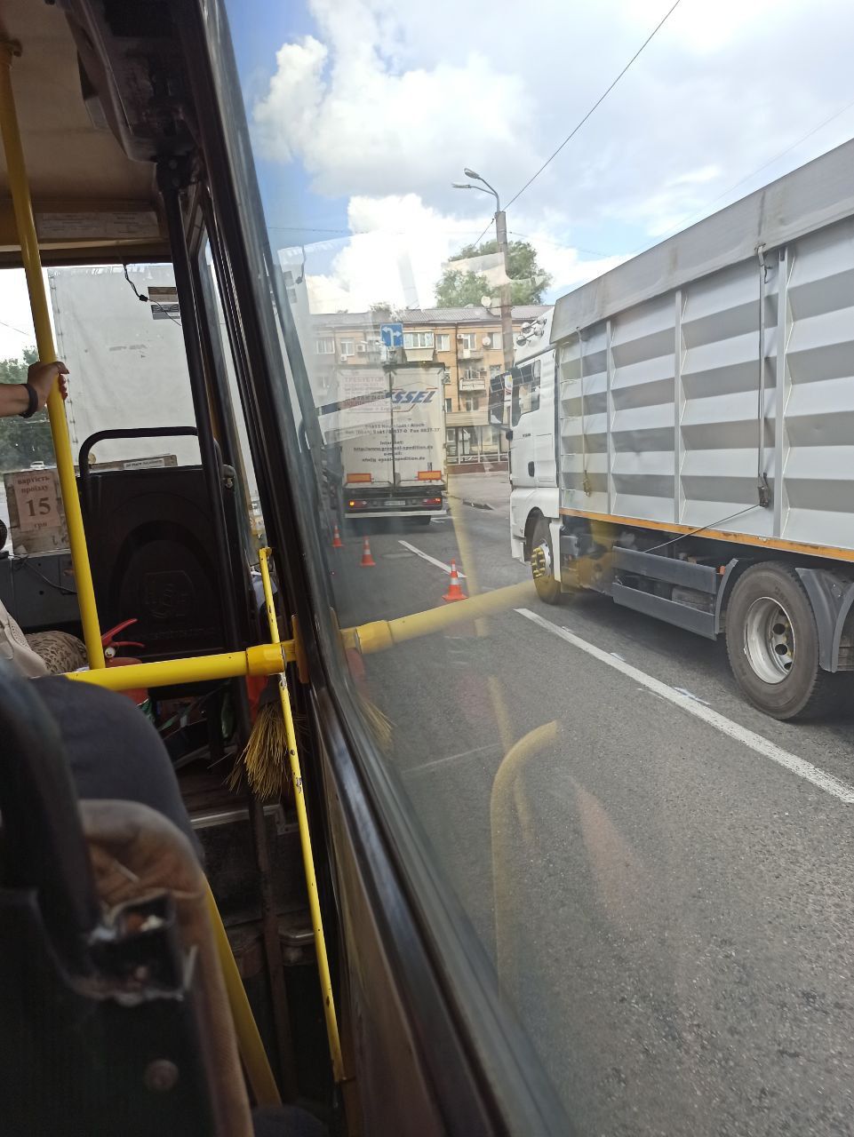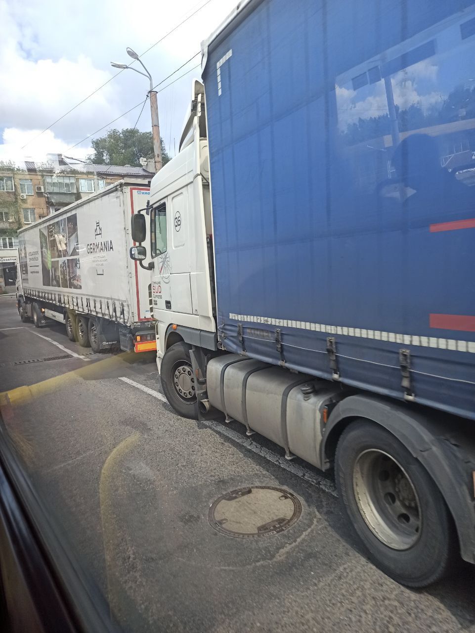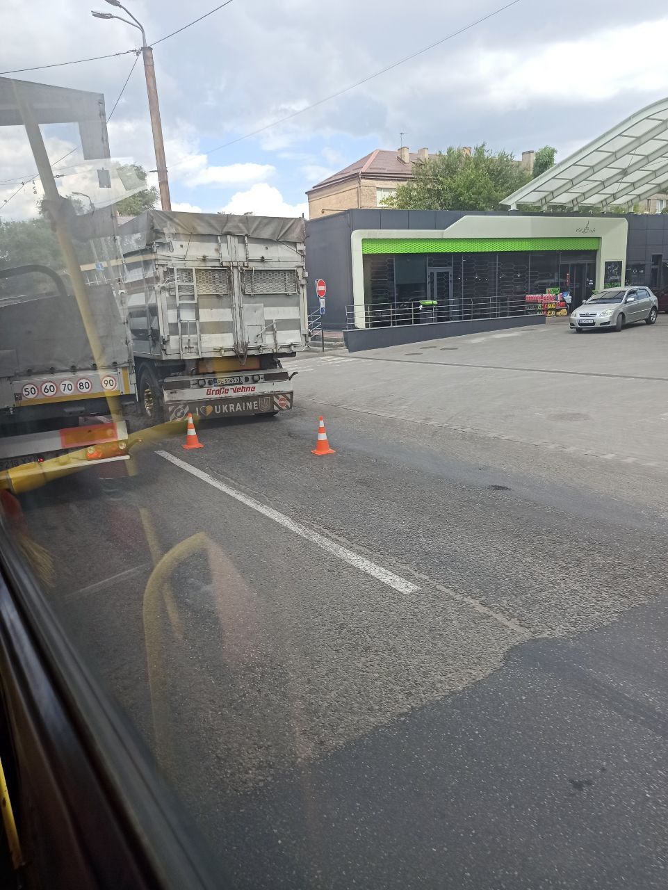Також ускладнено рух біля станції метро Метробудівників. Тут в ряд стоять три фури "на аварійці".