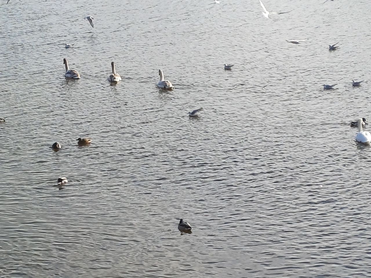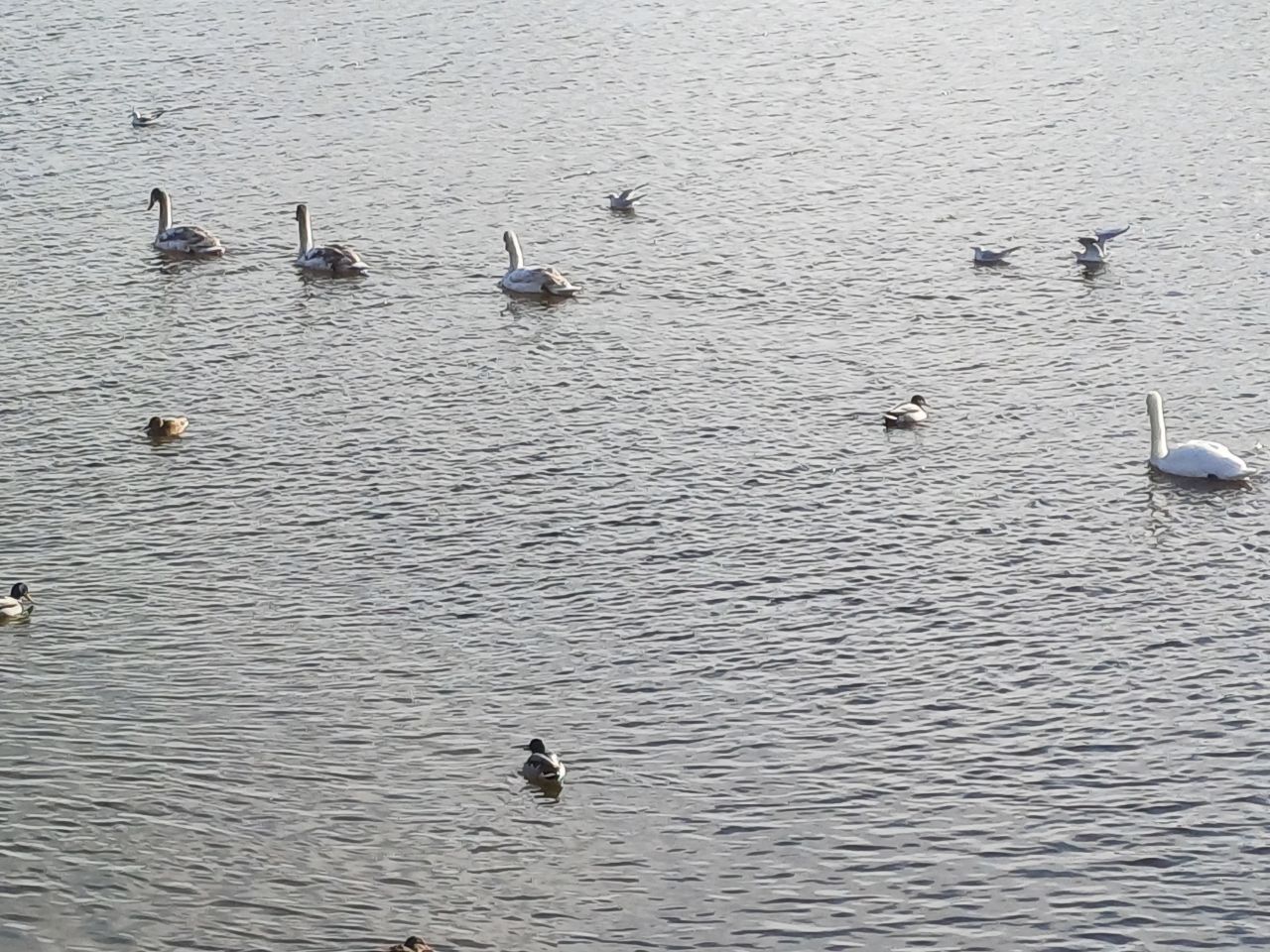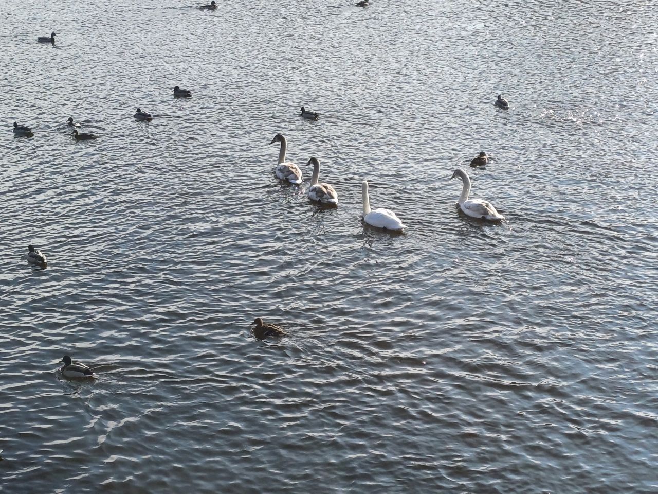 На відео можете побачити, як п'ятеро лебедів плавають разом з качками, у річці поблизу коси Перемоги-6.