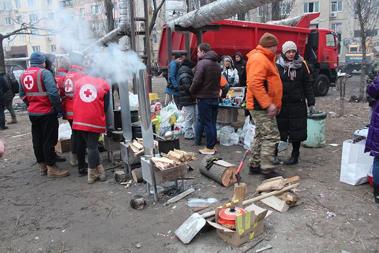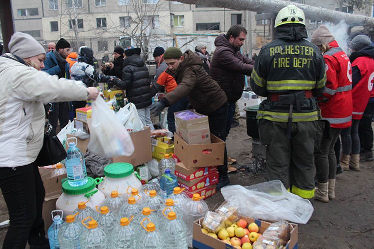 Неподалік зруйнованого будинку активно працюють волонтери, які організували пункти обігріву. Працюють намети, в яких можна випити гарячого чаю та підзарядити мобілку.