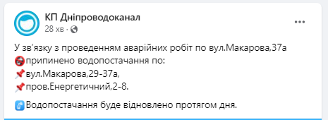 Також у зв'язку з проведенням аварійних робіт припинено водопостачання: