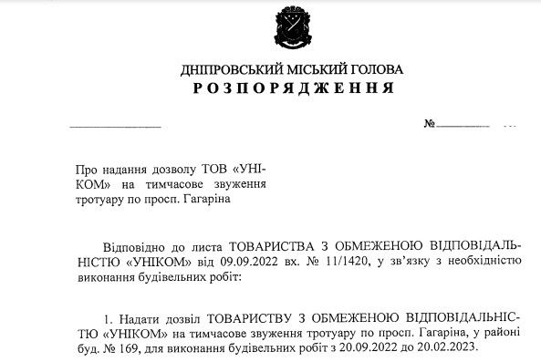 У документі зазначається, що у зв'язку з проведенням будівельних робіт, буде звужено частину тротуару в районі будинку 169 по проспекту Гагаріна. Біля зони проведення робіт мають установити огорожу та попереджувальні таблички.