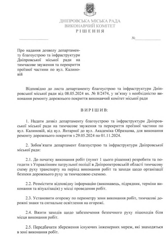 У Дніпрі з 29 травня на п’ять місяців перекриють рух по вулиці Калиновій. Про це йдеться у проєкті рішення, який оприлюднили на сайті міськради Дніпра.