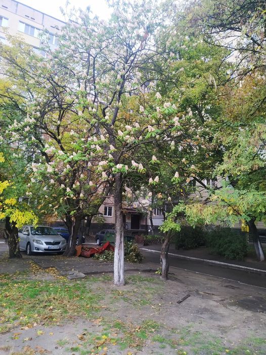 У Дніпрі на ж/м Парус буйно квітнуть каштани. Дерева, які посеред літа майже засохли та вкрилися жовтим листям, повторно зацвіли майже наприкінці жовтня.